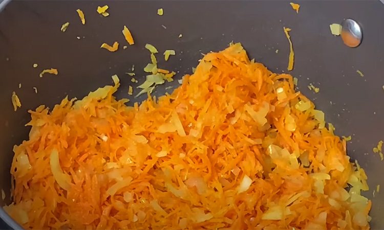 Нарежьте луковицу мелкими кубиками, а морковь натрите на тёрке. Разогрейте кастрюлю на плите и добавьте в неё ложку растительного масла, а также 7-10 грамм сливочного масла. Высыпьте нарезанные лук и морковь в кастрюлю и пассеруйте их буквально минуту, чтобы овощи стали мягкими и приобрели аппетитный аромат. Залейте в кастрюлю 1 литр горячей воды и доведите суп до кипения.