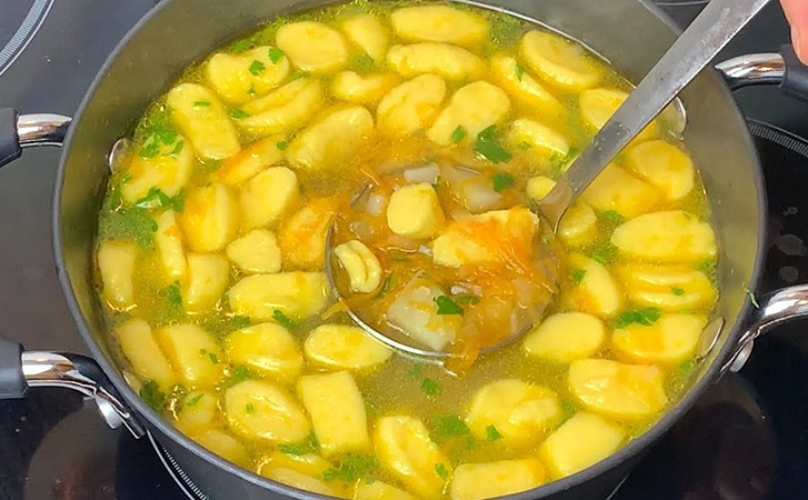 Аппетитный суп из простых продуктов легко варится буквально за 15-20 минут, без лишних хлопот со сложными ингредиентами. Похлебка получается невероятно вкусной и сытной, хотя мяса в ней ни грамма. Отчасти суп напомнит классические похлебки с клецками, только получится еще более ароматным.