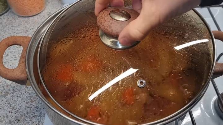 Доведите до кипения, уменьшите огонь до среднего, накройте крышкой, варите около 40 минут до мягкости моркови.