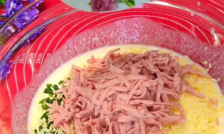 В глубокой посуде взбиваем яйца, вливаем к ним кефир и добавляем соль, сахар, мелко нарезанную петрушку, а еще тертый сыр и тертую колбасу. И то, и другое можно натереть на крупной терке.