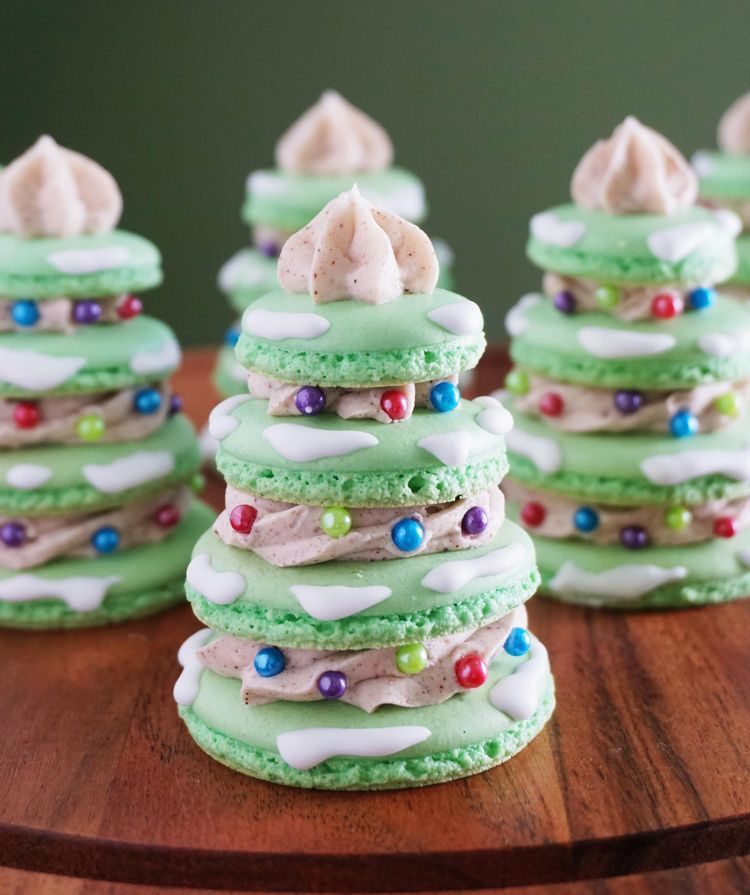 Макаронсы в виде ёлочек, промазанные сливочным кремом