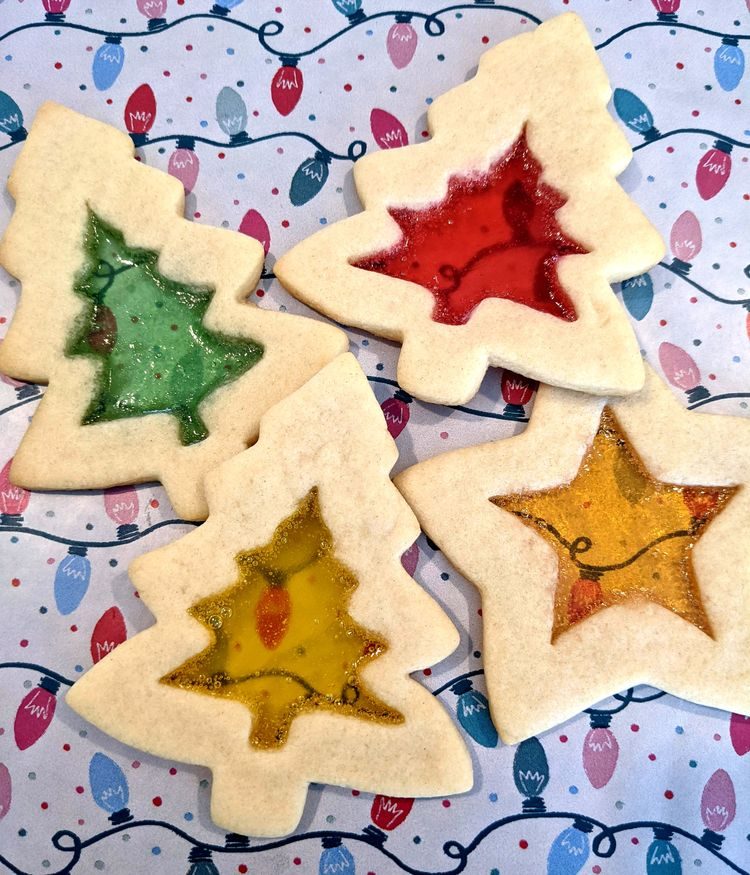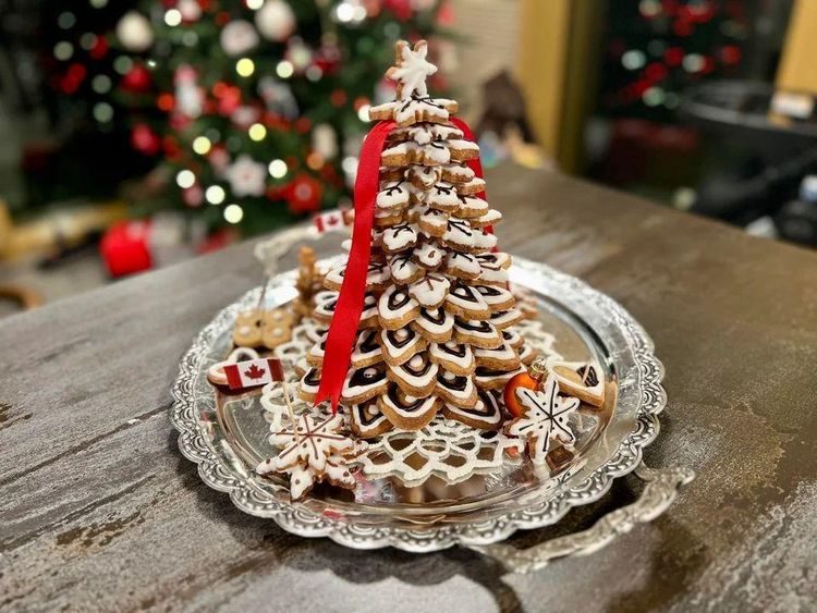 Из песочного печенья в виде снежинок можно сделать ёлочку, сложив его таким образом и «скрепив» растопленным шоколадом