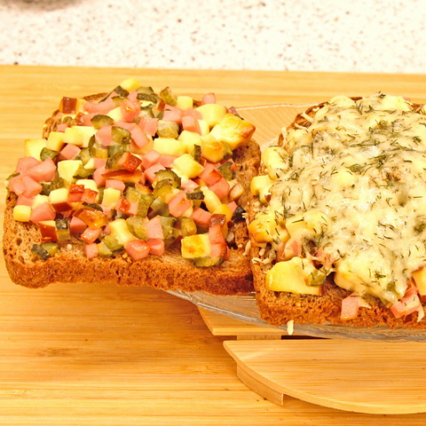 Горячие бутерброды с колбасным сыром, маринованными огурчиками и чесночком