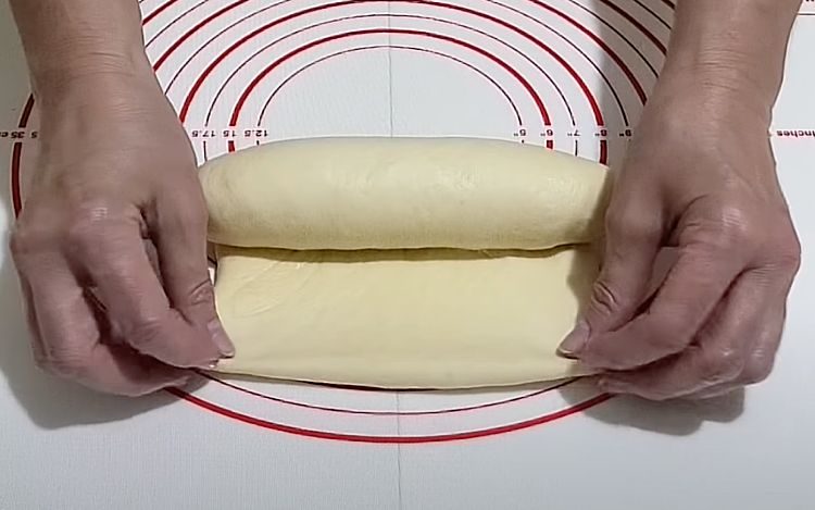 2. Добавьте сливочное масло и продолжайте замешивать тесто. Дайте ему подойти, а затем разделите на две равные части. Закройте пищевой пленкой и оставьте на 10 минут для расстаивания.