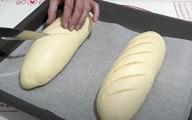 4. Сделайте равномерные надрезы на тесте и оставьте еще на 20 минут. Для смазки, взбейте яйцо с солью и водой. Аккуратно смажьте батоны этой смесью.