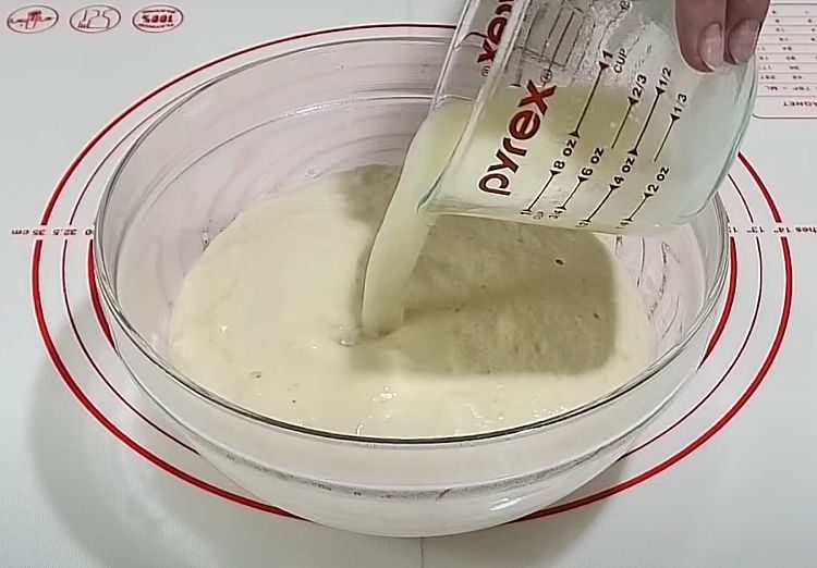 1. В глубокой миске соедините опару, молоко, сахар, соль и муку. Замешивайте тесто до получения однородной, плотной массы, которая почти не липнет к рукам.