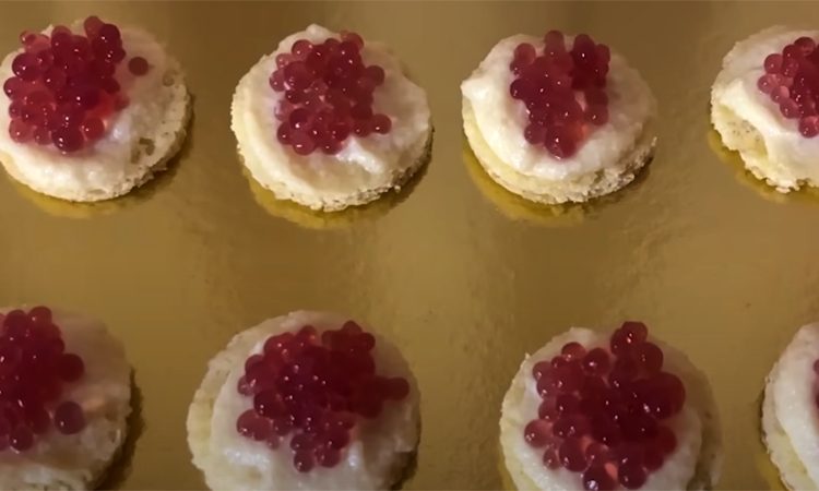 Растительное масло наливаем в стакан и максимально охлаждаем в холодильнике. Желейную основу набираем в шприц и капаем в масло — образуются «икринки». Промываем их в теплой воде. Из бисквита вырезаем кружочки, мажем их заварным кремом и сверху выкладываем «икринки». Получается очень похоже на бутерброд с икрой — гости точно удивятся!