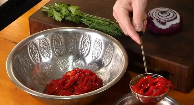Открываем банку с лечо. С помощью ситечка отделяем весь соус. Очищаем красный лук. Мелко его нарезаем. Смешиваем лук с болгарским перцем.