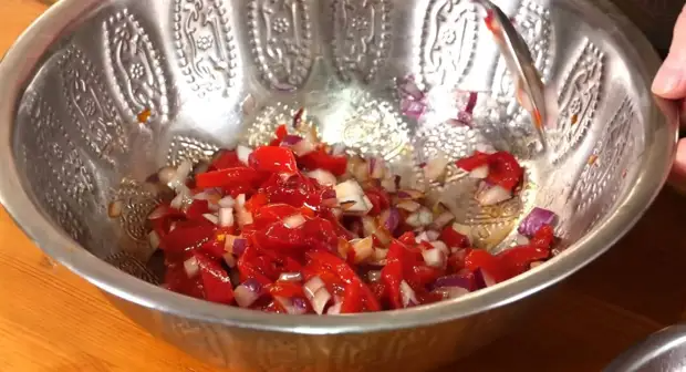 Первой следует открывать банку с лечо. Нам нужно отделить болгарский перец от соуса, используя шумовку или ситечко. Затем к нему необходимо добавить мелко нарезанный репчатый лук. Далее всё хорошенько перемешиваем. Благодаря этому лук успеет слегка промариноваться и утратить свой слишком резкий вкус и аромат.Ингредиенты