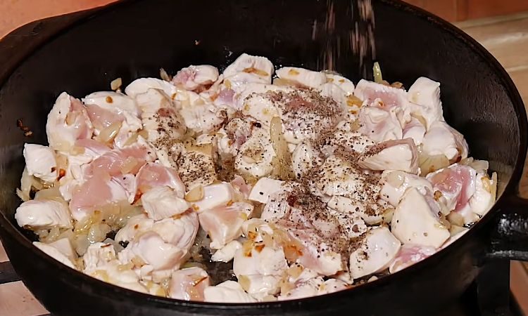 1. Разогрейте сковороду на среднем огне. Обжаривайте мелко нарезанный лук на сале до полупрозрачности. Добавьте к луку нарезанное куриное мясо кусочками среднего размера и готовьте, пока мясо не приобретет белый цвет. Приправьте перцем и солью.