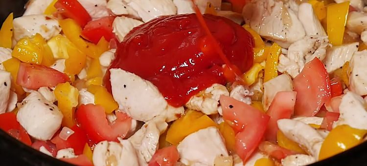 2. Положите на сковороду кубики болгарского перца и произвольно нарезанный помидор. Добавьте кетчуп, соевый соус и соус чили. Залейте чуть-чуть воды и тушите под крышкой на слабом огне примерно 10 минут. Величьте огонь и дайте жидкости выпариться, чтобы начинка стала густой.