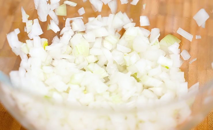 1. Начнем с подготовки лука. Луковицу мелко нарежьте кубиками и поместите в глубокую миску. Добавьте 1 столовую ложку 6% уксуса, 2 столовые ложки воды и 1 чайную ложку сахара. Оставьте лук мариноваться в смеси на 10 минут, затем слейте излишнюю жидкость.