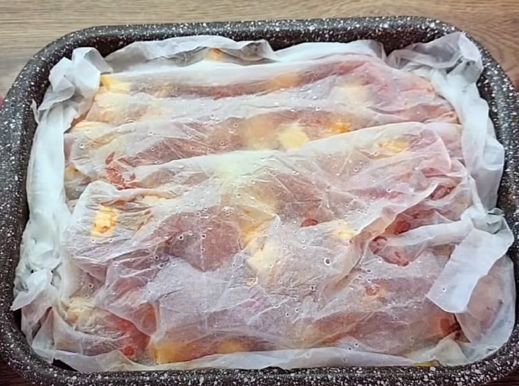 5. Покройте форму для запекания пергаментной бумагой, чтобы сохранить влажность. Предварительно разогрейте духовку до 200 градусов Цельсия. Поместите форму в духовку и готовьте блюдо в течение 40 минут.