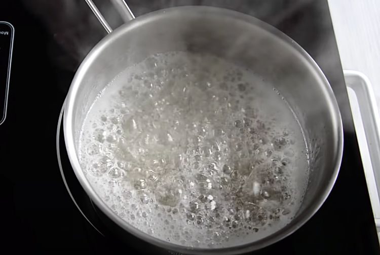 2. В кастрюле с толстым дном соединяем 400 г сахара, 100 мл воды и сок половины лимона. На среднем огне доводим сироп до кипения, после чего варим его на среднем огне в течение 5 минут.