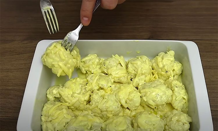 Цветную капусту разбираем на соцветия и отвариваем в соленой воде в течение пары минут. Отдельно смешиваем яйцо, натертый сыр, сметану, соль, перец, сушеный чеснок. В эту массу кладем отваренную капусту.