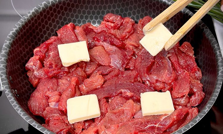 Верните в сковороду мясо, положите сверху несколько кусочков сливочного масла для дополнительной сочности. Влейте к мясу приготовленный ранее соус-маринад.перемешайте, и томите уже на слабом огне 8-10 минут.