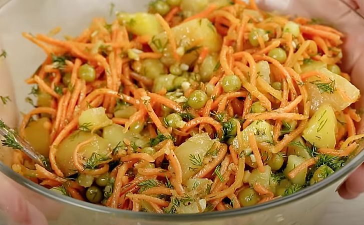 Обычно отваренный картофель служит простым гарниром, но сегодня мы предлагаем нечто другое. За 5-10 минут мы превратим его в насыщенный теплый салат, способный заменить не только гарнир, но и выступить в роли основного блюда. В этом рецепте мы добавим простые ингредиенты — морковь, немного зеленого горошка, чеснока и зелени.