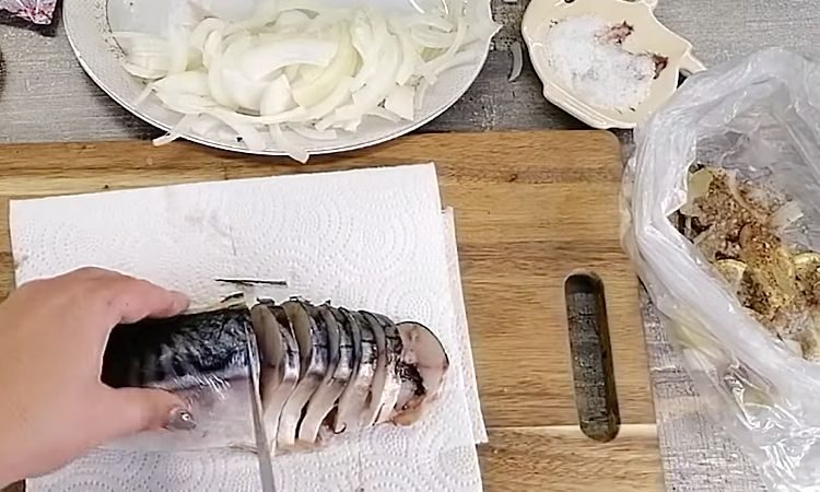 2. Нарежьте скумбрию тонкими ломтиками (не более 5 миллиметров) для более быстрой засолки и насыщенного вкуса специй.