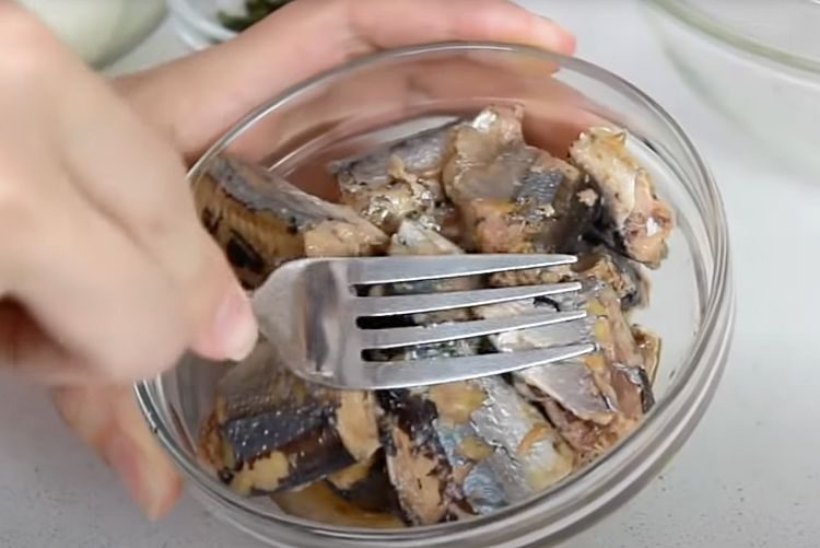 1. Откройте банку рыбных консервов и разомните ее вилкой в глубокой миске. Мелко нарежьте лук и добавьте к размолотой рыбе.