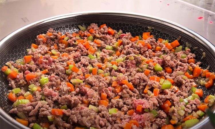 В сковороде на оливковом масле обжариваем мелко нарезанный лук, чеснок, морковь и сельдерей. Через несколько минут добавляем к овощам фарш, солим и перчим его и слегка обжариваем. Теперь выливаем на сковороду красное вино и тушим 5 минут.