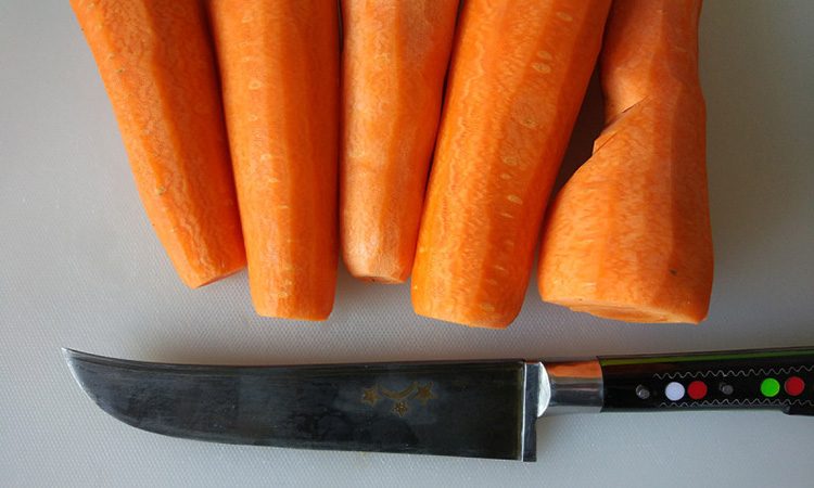 У нас должны получиться тонкие и длинные кусочки, примерно равне по толщине. Это важно, поскольку правильно нарезанная морковь сохранит свою текстуру и не разварится в кашу. Работать удобнее всего большим шеф-ножом, как это делают ошпазы.