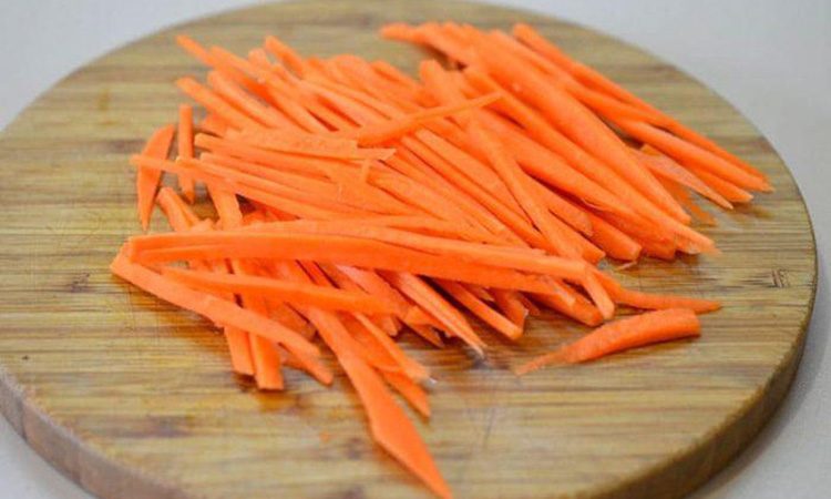 Для начала тщательно моем и чистим морковь. И начинаем нарезать ее тонкой соломкой вдоль плода. Здесь неопытные кулинары часто совершают ошибку, нарубая морковь поперек.