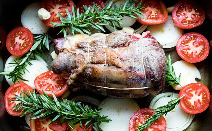 3. На противне разложите кольца лука, половинки помидоров, чеснок и веточки розмарина. Разместите готовую рульку в центре.