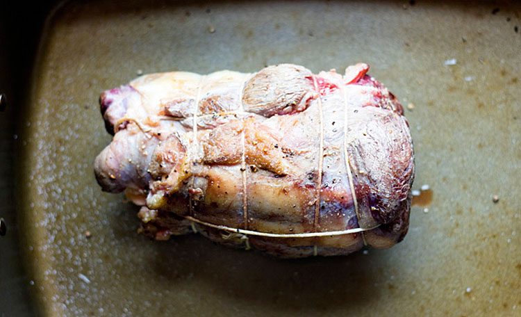 5. Поставьте противень в разогретую до 135 градусов духовку и готовьте мясо в течение 3 часов. Проверьте готовность рульки после 3 часов — мясо должно легко разваливаться на волокна. Если нужно, продолжайте готовить, проверяя каждые 20 минут.
