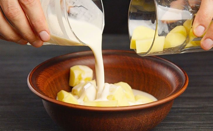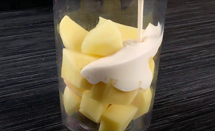 1. В чашке блендера соедините картошку, ряженку, лук и чеснок. Тщательно взбейте блендером до получения однородной массы. Полученную жидкость поместите в большую чашку.