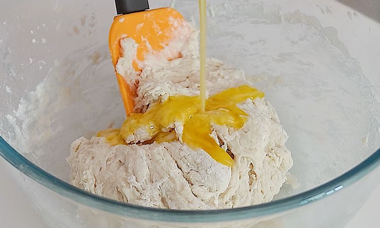 2. В другой емкости смешайте муку и соль, добавьте молоко с дрожжами, перемешайте, пока не получится мягкое тесто. Добавьте топленое масло и еще раз перемешайте.