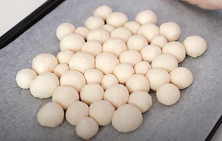 5. Руками скатайте из каждого квадратика маленький шарик и выложите на противень, застеленный пергаментом.
