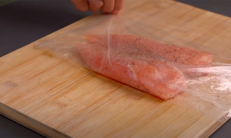 Сначала замаринуем куриную грудку. Натираем ее солью и перцем и отбиваем. Теперь посыпаем мукой и обжариваем грудку на сливочном масле до золотистой корочки с обеих сторон… Теперь приготовим соус.