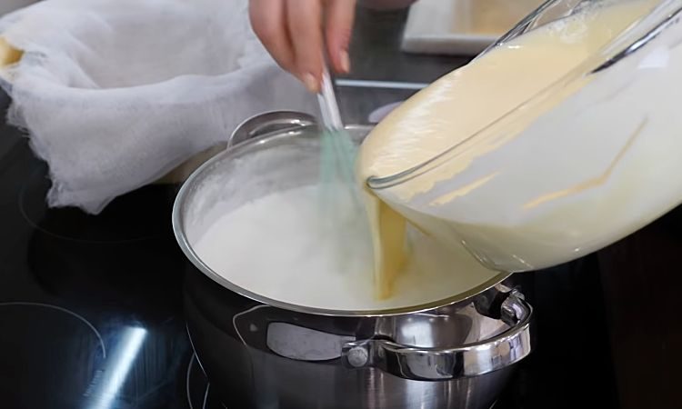 2. Возьмите большую кастрюлю и налейте в нее 2 литра магазинного молока, посолите. Поставьте на средний огонь и доведите его до кипения, помешивая, чтобы предотвратить пригорание. Как только молоко закипит, плавно введите в него приготовленную сметанно-яичную смесь. Постоянно помешивайте, пока сырная масса не начнет отделяться от сыворотки, что обычно занимает около двух минут.