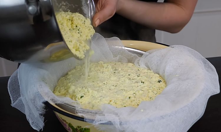 4. Когда сырная масса отделяется от молочной, процедите ее через двойную марлю, затем отожмите.