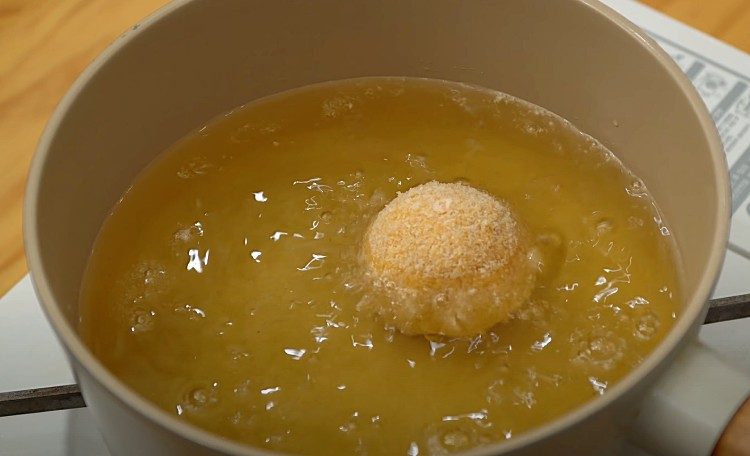 7. Нагрейте сковороду с маслом на среднем огне. Как только масло достигнет определенной температуры, аккуратно выложите панированные шарики в раскаленное масло. Обжаривайте шарики, периодически переворачивая, до золотистой корочки со всех сторон, примерно 2-3 минуты на каждой стороне.