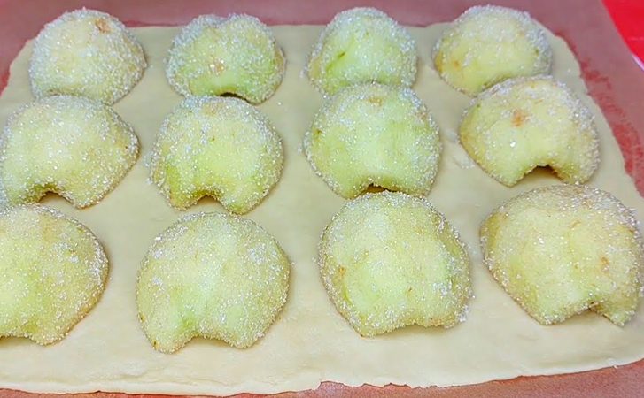 В это время подготовим яблоки. Моем их, очищаем от кожуры, вырезаем сердцевины и разрезаем каждое на две половинки. Обваливаем яблоки в сахаре и корице. Достаем тесто и разрезаем его на две части. Раскатываем одну часть и выкладываем на нее яблоки сердцевиной вниз.