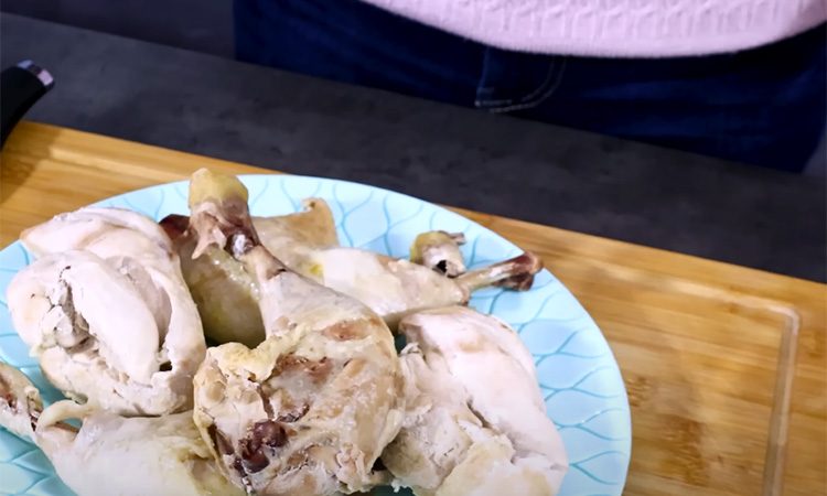 Варим куриное мясо с луковицей, лавровыми листами и горошинами перца до готовности. Выкладываем мясо на тарелку, чтобы оно остыло, и отделяем от костей. Затем нарезаем мясо и кладем его в миску. Добавляем порубленный чеснок, соль и перец по вкусу.
