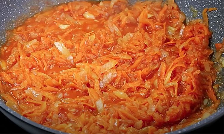 Залейте рис стаканом горячей воды, добавьте щепотку соли, уменьшите огонь и варите под крышкой 10 минут. Нарежьте капусту мелко, залейте кипятком на 5 минут, затем откиньте на дуршлаг. На сковороде разогрейте подсолнечное масло, обжарьте мелко нарезанный лук и натертую на крупной терке морковь. Добавьте измельченный чеснок, соль, перец, приправы, обжаривайте еще несколько минут, затем уберите овощи с огня.