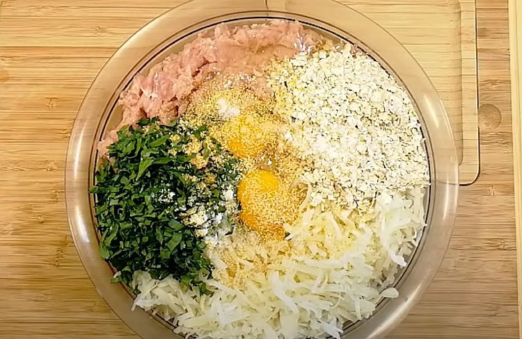 2. В глубокой миске смешать фарш, капусту, овсяные хлопья, рубленую зелень, яйца и специи. Хорошо перемешать и оставить на 5 минут.