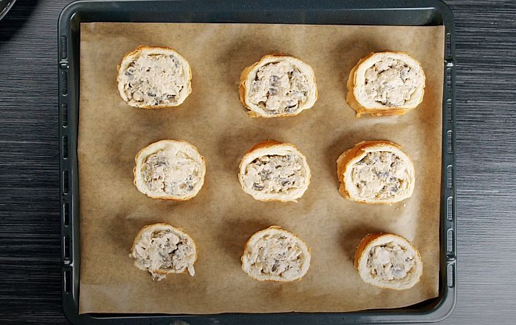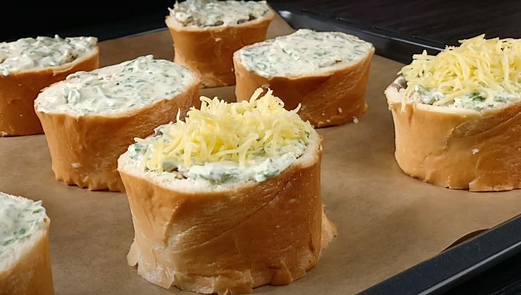 7. Выложите подготовленные багеты на противень, выложенный пергаментом. Наполните выемки в багетах приготовленной начинкой.