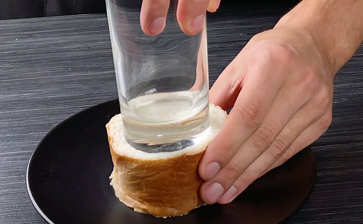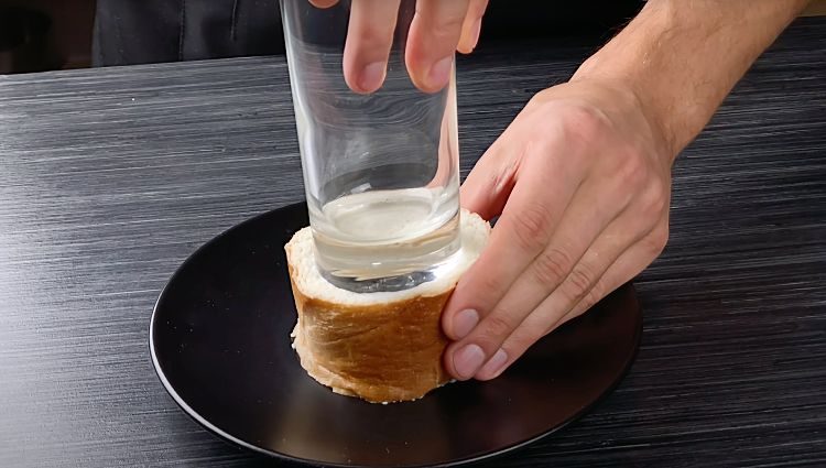 6. Для формирования багетных корзиночек возьмите стакан с диаметром, немного меньшим, чем у багета, и используйте его, чтобы выдавить середину каждого кусочка багета, сохраняя стенки и дно примерно 1 см толщиной.