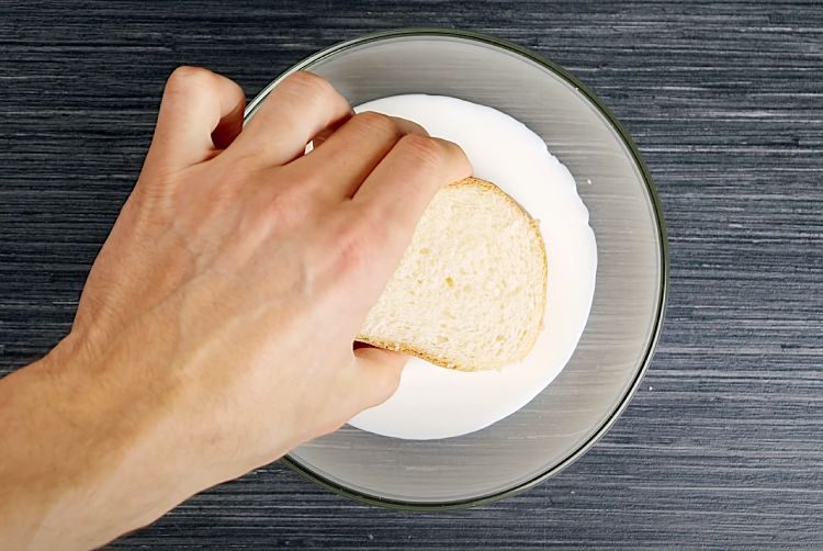 5. Пока начинка готовится, займитесь подготовкой багета. Разрежьте багет поперек на кусочки примерно длиной 5-7 см, затем погрузите их в молоко для размягчения.