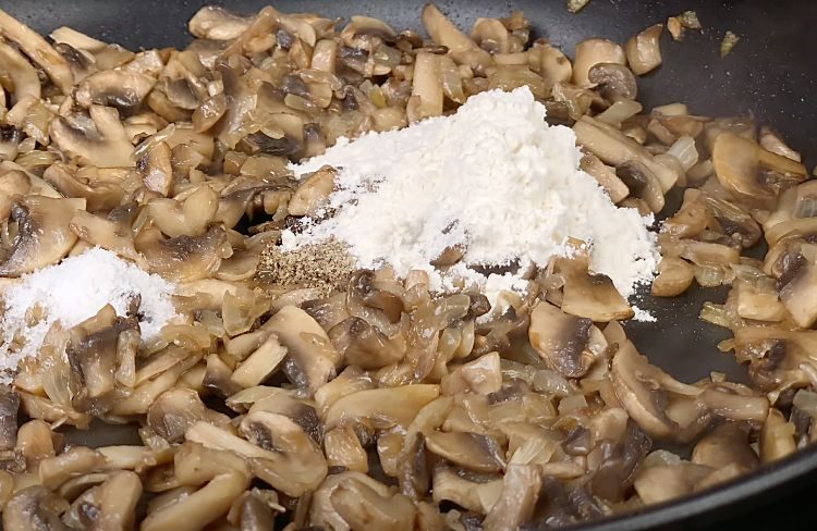 2. На сковороде разогрейте немного масла и обжарьте лук до золотистости. Добавьте нарезанные грибы и жарьте, пока они не станут мягкими и не выведут лишнюю влагу. Посыпьте грибы с луком мукой и перемешайте.