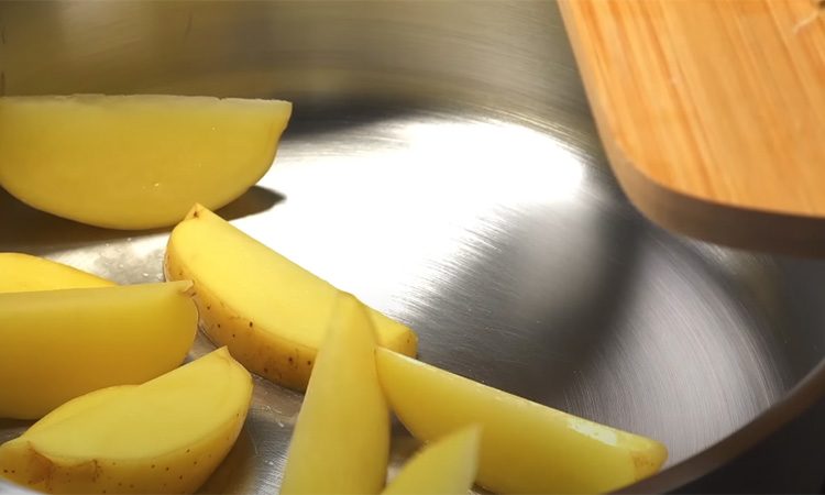 Промойте картофель и разрежьте его на дольки. Положите картофель в кастрюлю с холодной водой, добавьте 1,5 ч.л. соли и доведите до кипения. Варите 3 минуты. Добавьте растительное масло, укроп, петрушку, чеснок, соус чили и оставшуюся соль.