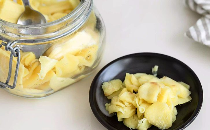 Маринованный имбирь прекрасно сочетается с блюдами из рыбы и риса, что делает его превосходным дополнением к японской кухне. Кроме того, его можно использовать как дополнение к острым мясным и птичьим блюдам, таким как карри или терияки. Вместо того чтобы брать готовый маринованный имбирь в магазине, его можно с легкостью приготовить из свежего корня. Одного корня имбиря достаточно для небольшой банки.