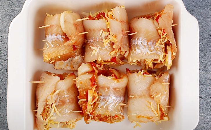 4. Осторожно сверните каждый кусок филе в рулет, начиная с более тонкого конца и заканчивая более толстым. Закрепите каждый рулетик зубочисткой, чтобы он не развалился во время приготовления.