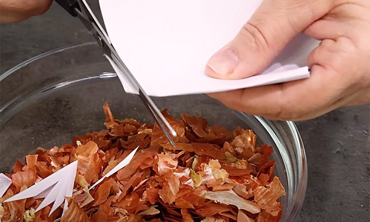 Подготовьте луковую шелуху и гибискус для крашения яиц. Нарежьте шкурку лука на небольшие кусочки и разорвите бумагу для заворачивания яиц. Налейте уксус (9% или 5%) в миску и подготовьте марлю с ниткой.