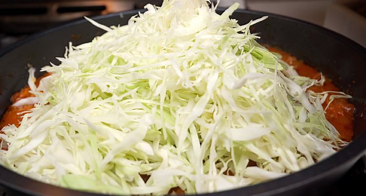 6. После тушения фарша добавьте нарезанную капусту. Помешивайте, чтобы капуста была равномерно покрыта соусом. Продолжайте тушить под крышкой еще около 15 минут, или пока капуста не станет мягкой.