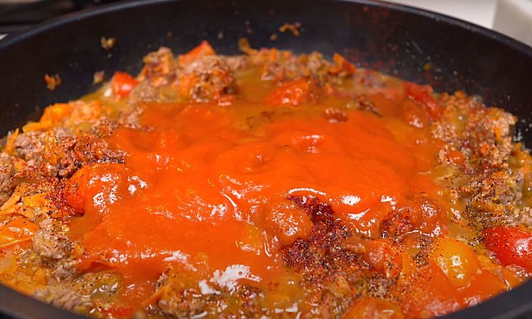 5. Посыпьте паприкой и черным перцем. Перемешайте, чтобы специи равномерно распределились. Влейте томатный соус и тщательно перемешайте. Уменьшите огонь до среднего и дайте смеси повариться под крышкой около 10 минут, чтобы ароматы хорошо смешались.