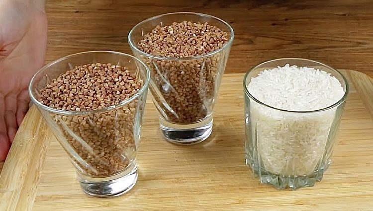 1. В две кастрюли на среднем огне налейте достаточное количество воды и доведите до кипения. Добавьте гречку и рис в кипящую воду. Варите крупы, периодически помешивая, до полной готовности, около 15-20 минут. Отцедите крупы через сито и оставьте на некоторое время, чтобы избавиться от лишней влаги.